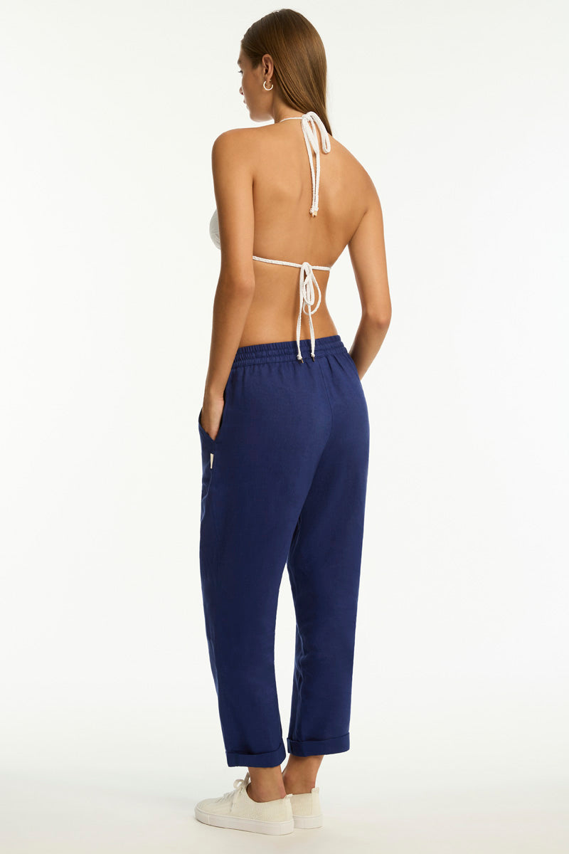 **Product Summary:** The SL9058TL French Navy Tidal Linen Beachcomber Pant by Sea Level Australia is designed for the modern, active woman who values both style and comfort. These versatile pants are crafted from lightweight, breathable linen, making them perfect for beach outings, casual gatherings, or summer adventures. The chic French navy color offers a sophisticated yet laid-back vibe, easily pairing with various tops. **Highlights:** - **Lightweight and Breathable:** Made from high-quality linen for ultimate comfort in warm weather. - **Fashion-Forward Design:** The stylish beachcomber pant silhouette complements various body shapes, ideal for the fashion-conscious twenty-something. - **Versatile Use:** Perfect for beach lounging, casual outings, or layering over swimwear. - **Easy Care:** Simple to wash and maintain, ensuring they remain a staple in your summer wardrobe. Embrace effortless summer style with these chic beach pants that blend practicality with modern fashion sensibilities!